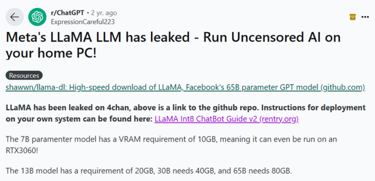 - Discussion sur la fuite du modèle LLaMA de Meta – https://news.ycombinator.com/item?id=35007978