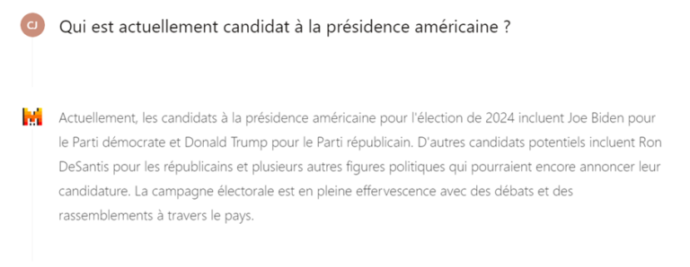 Par exemple, si un LLM est interrogé sur un événement historique qui n’a jamais eu lieu, il pourrait créer une réponse détaillée et convaincante, mais complètement fictive. Cette « hallucination » n’est pas intentionnelle de la part de l’IA ; elle résulte simplement de la manière dont le modèle a été entraîné à générer du texte en fonction des patterns qu’il a appris. Par exemple, dans la capture ci-dessous du 25/09/2024, l’IA n’a pas encore pris en compte que Kamala Harris a remplacé Joe Biden en tant que candidate démocrate.